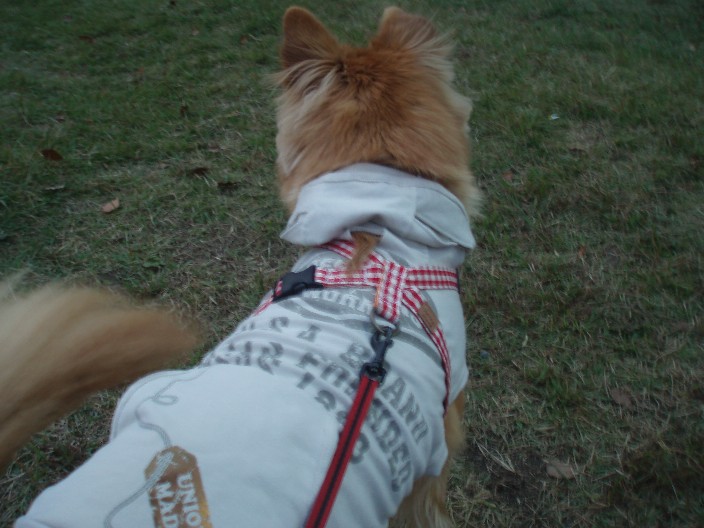 パーカー付の服にはリードをだす穴が開いているのですが、