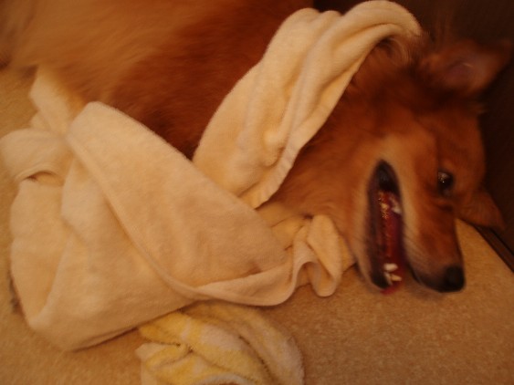 洗い終わったあと、風呂場でブルブル、脱衣所でタオルドライ。