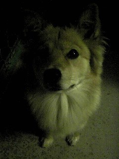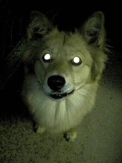 オヤツのマテ中葉月たん。 「おやつくれなきゃ」 「おこるどー!」 なんてことはないです(笑) ライト使うか使わないでこの違い・・・。 目が光るとコワイです。