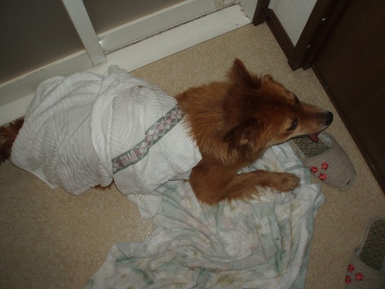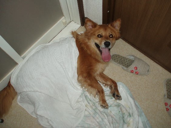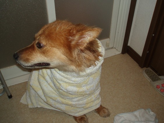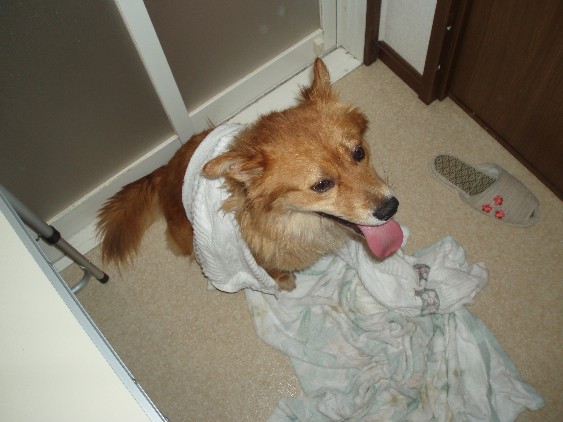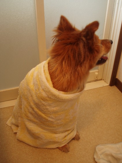 洗い終わったあと、風呂場でブルブル、脱衣所でタオルドライ。